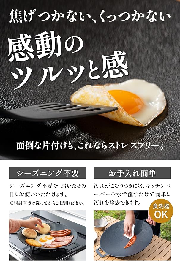 【焦げつきにくく、お手入れもラク】独自配合の特殊フッ素樹脂加工で、驚くほどの焦げ付きにくさと高耐久を実現。使い始めのツルっと感が、いつまでも続きます。シーズニング不要で、使用後はキッチンペーパーや水でサッと拭くだけ。