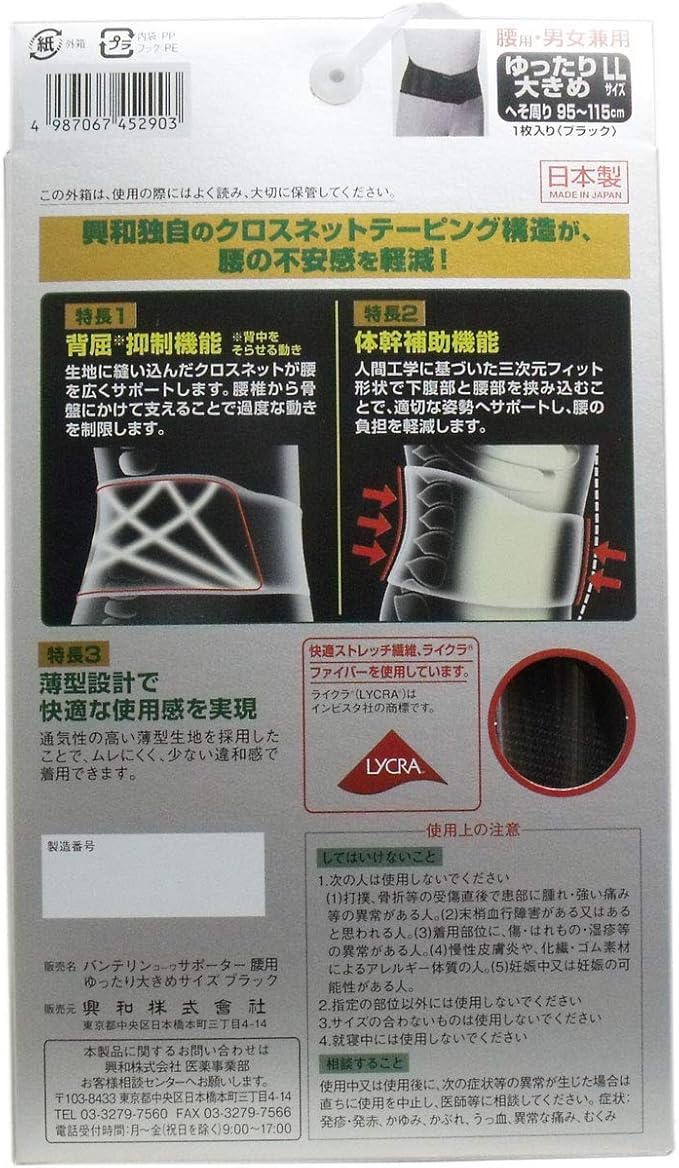 【美浜通商-ORS4A01】バンテリンサポーター 腰用 ゆったり大きめ LLサイズ ブラック 1枚入