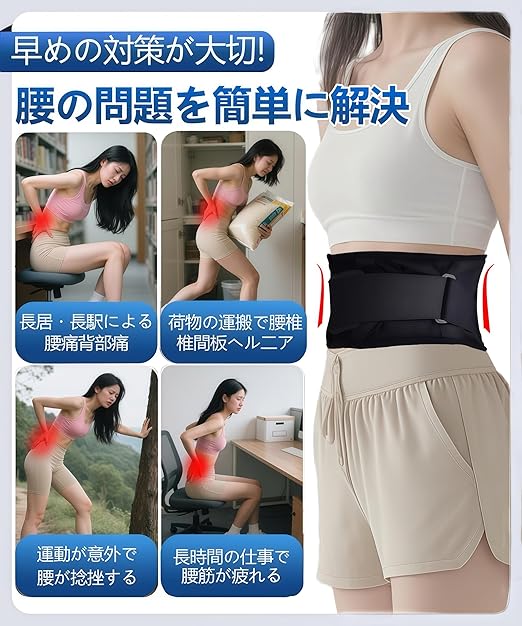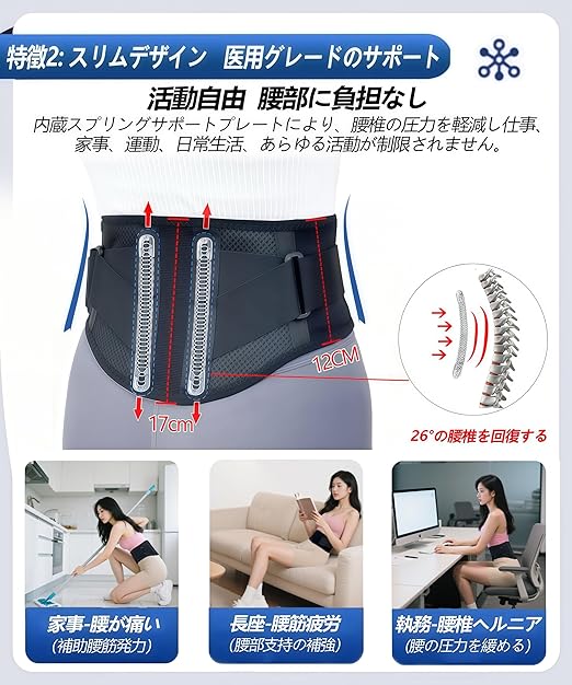 【腰楽コルセット/薄型・軽量】高密度メッシュ素材を厳選し、3 Dメッシュで通気性があり、暑い日や高強度の運動時でも汗を排出し、腰をサラサラにし、蒸れ感を低減します。軽量スリム版タイプで、幅わずか17 CMで、室内とアウトドアの日常的な着用に便利で、腰の曲線にフィットします。姿勢矯正ベルト、腹巻ベルト、シェイプアップベルトとしても使用できます。