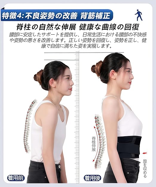 【姿勢補正/ 腰痛対策】不良姿勢を改善し、二重サラウンド式に腰部を固定することにより、腰部に強力で安定した支持力を提供し、脊柱を正常に自然に伸展させ、長期的に装着することにより、正しい姿勢を維持することを助け、それにより腰部痛などの腰部問題を改善し、腰部と腰椎の健康を保護する。