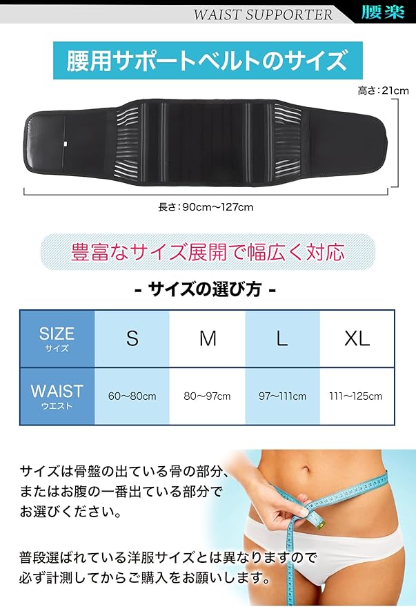 大人から子供までどんな体型にもフィット、男女兼用でコルセットを装着したまま締め付け具合を調節できます。Sサイズ(お腹周り60-80cm)・Mサイズ(お腹周り80-97cm)・Lサイズ(お腹周り97-111cm)・XLサイズ(お腹周り111-127cm) ※普段選ばれている洋服サイズとは異なりますので、必ず計測してからご購入をお願いします。・ご年配の方にも解りやすいイラスト入りの説明書付きです。