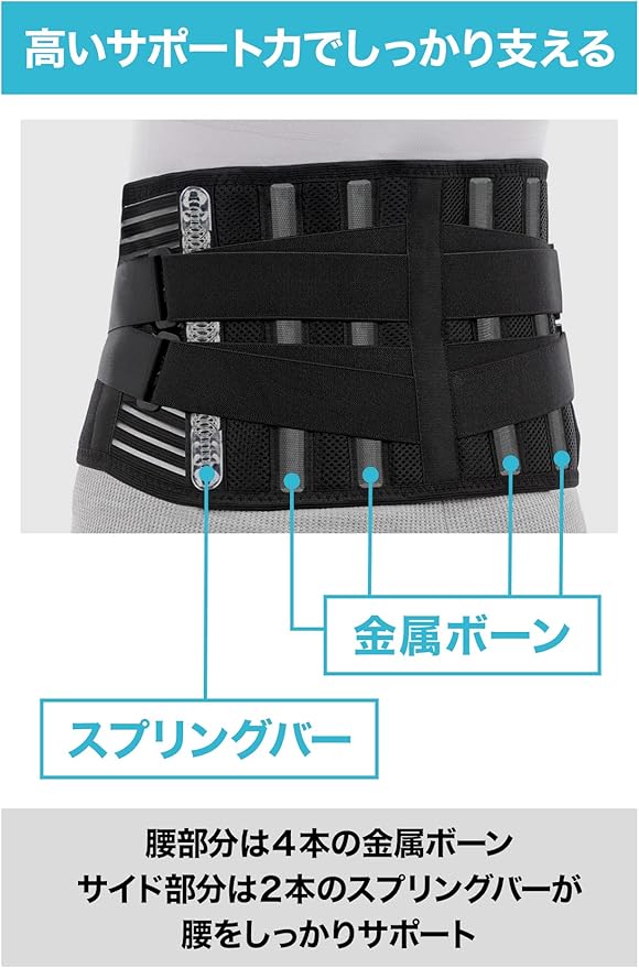 背面に6ボーンを搭載し腰をしっかりサポート。4本のステンレスボーン+2本の弾力性スプリングバー、計6本の支柱が腰椎を支えます。高いホールド力で、若者からお年寄り、男性女性、全ての方に着用いただけるよう設計されております。