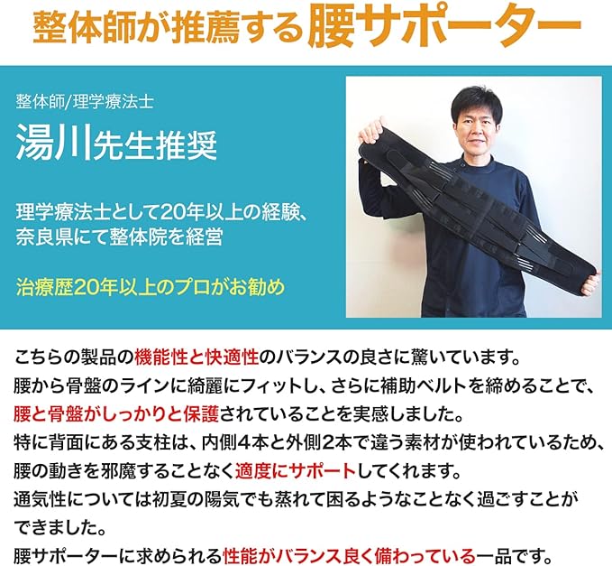 腰をしっかり支える腰用サポートベルト。【治療歴20年以上の整体師/理学療法士湯川先生推奨】二重ベルトと6本の支柱で強力に固定。クロス構造設計で腰にしっかりフィット。今までの腰コルセットでは物足りない方にも使っていただきたいコルセットです。