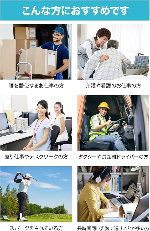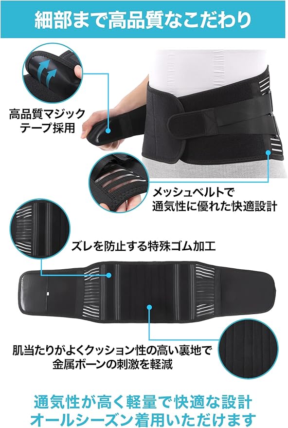 補助ベルトにはテコの原理を応用した滑車を搭載し、女性やお年寄りでも弱い力でしっかりと締め付けることができます。腰のあたる内側にはクッション性の高い裏地を採用し肌当たりがとても良く快適にご着用いただけます。腰を酷使するお仕事、介護や看護、座り仕事、デスクワーク、タクシー運転手やトラックドライバーの方、スポーツをされている方にもおすすめです。