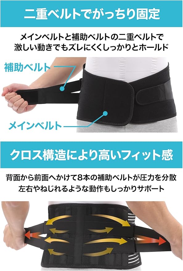 メインベルトと補助ベルトの二重ベルトで、激しい動きでもズレにくくしっかりホールドします。背面から前面にかけて8本の補助ベルトが圧力を分散し、ねじれるような動作でもしっかりサポート。人の様々な動きにも対応した設計で、日常生活やスポーツで腰に負担をかけている方におすすめです。