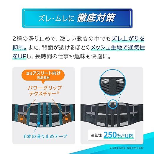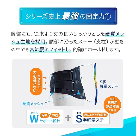 【シリーズ最強の固定力①】:背部に内蔵された、当社用製品にも採用されているS字軽量ステー(支柱)が腰の反りすぎを抑制。また従来品よりもさらに強力になった2本のアジャスター付きW補強ベルトで、腰を強力にサポートします。