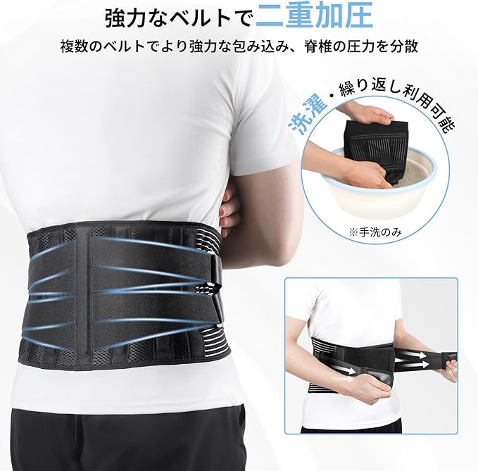 【強力に固定できる二重加圧ベルト】必要に応じて調節でき、着脱も簡単な2種類のベルト付き:微調整できる補助ベルトの引っ張る感じもしっかりとしていて、腰の痛みも軽減されます。二重ベルトで、激しい動きでもズレにくく、着けた時の安定感も良く、長時間快適に使えます。