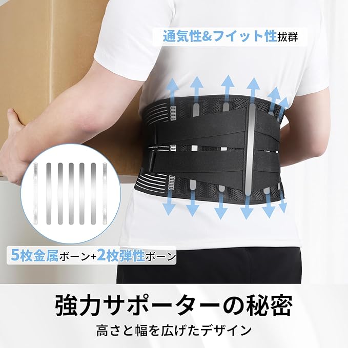 【優れたサポート力】5枚金属ボーン+2枚弾性ボーンを内蔵した腰痛コルセットで、腰をしっかり支えます。快適設計で腰の負担を軽減し、腰痛を和らげます。