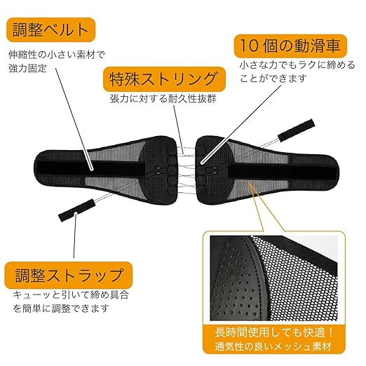 【新素材SBR通気性メッシュを採用】腰ベルトは通気性に優れたメッシュ素材を使用 しています。上質なSBR素材を使用しており、きめ細かく、柔らかく、柔軟性があり、断熱性と弾力性に富んでいます。 強力なマジックテープは、300回以上繰り返し接着しても使える頑丈な素材です。 内部のメッシュ構造のデザインで空気の流れを速くすることがで きます。内部の通気性が高く、蒸れにくく、汗を素早く蒸散させられるため、 季節を問わず一年中装着できます。また、滑車のデザインは通気性を高めるこ とでより楽に使用できるだけでなく、腰コルセットは装着が簡単で使いやすい です。