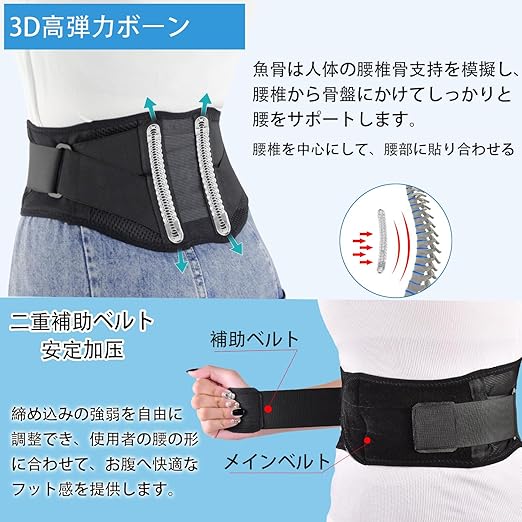 【高いホールド力】腰のカーブに合った特殊弾性ボーンと二重補助ベルトで、腰周りをがっちり支えて安定させ、腰椎から骨盤にかけてしっかりと腰をサポートします。長期着用により仕事や疲労による腰、腹部、背中の不快感を減少します。