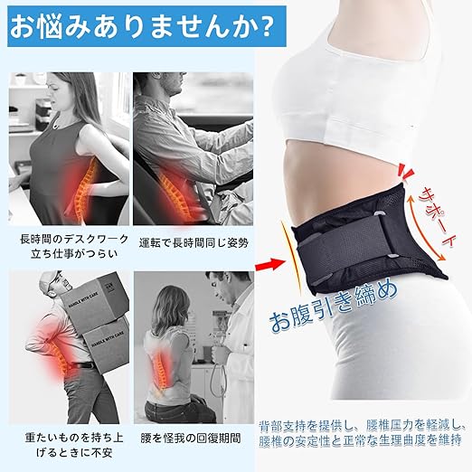 【あらゆる場面で活躍】長座するサラリーマン、長時間運転などの場合に適して、運搬作業時やスポーツ時でもずれにくく、着用したまま簡単に締め付け加減を調節でき、使用者の腰の形に合わせて自動に調整されます。腰用ベルトは姿勢補正やお腹引き締め、シェイプアップベルトとして、加えウエストが細くなり、ダイエット効果もあります。
