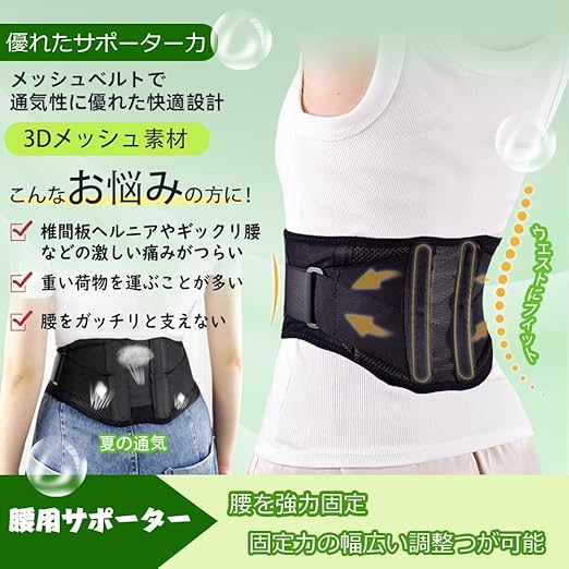【3D通気メッシュ素材を採用し】最も通気性に優れ、腰全体を快適にサポート。本体内側に汗を素早く蒸散させる。季節をとわず、一年中使用でき、快適な装着感。