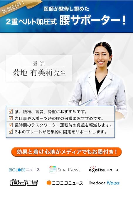【医師のお墨付き】2重ベルト加圧式腰サポーターはピラティスインストラクターでもある医師が監修し認めた逸品です!「腰、腰椎、骨盤、背骨におすすめです」「力仕事やスポーツ時の腰の保護におすすめです」と自信をもって勧めています。