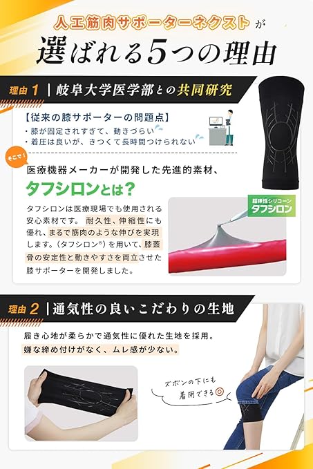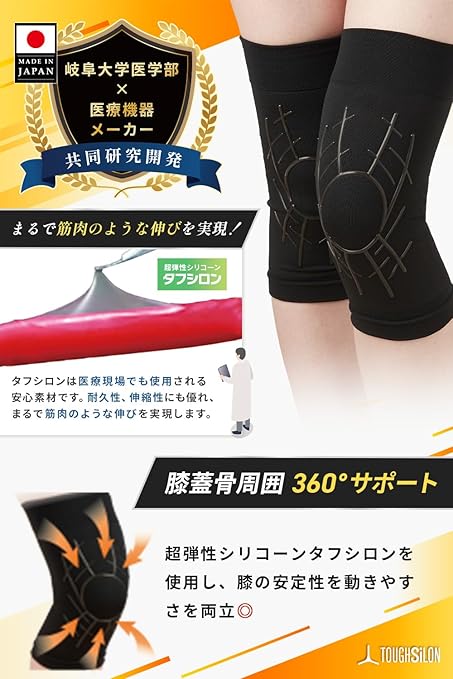 【岐阜大学と共同研究開発】 岐阜大学と共同研究開発により製品化。従来の膝サポーターの問題点に着目し、シリコーンを膝回りの筋肉に沿って立体的に配置することで、筋肉をサポ―トし安定した歩行を助けることを可能に。
