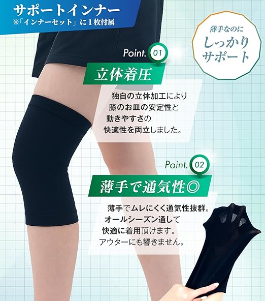 ✅【夏でもムレにくい薄手メッシュ】薄手・通気性メッシュ素材を採用した夏用膝サポーター〈RELAXEE ひざごこち〉は、汗を素早く逃がし、長時間のスポーツや登山でもさらっと快適。