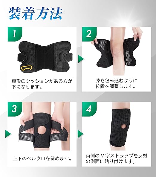 ✅【V字クロスベルトでぴったりフィット】上下2本のV型マジックテープを交差させ、膝周りを包み込むように調整。着脱が簡単で、動きに合わせた安定感を追求しました。