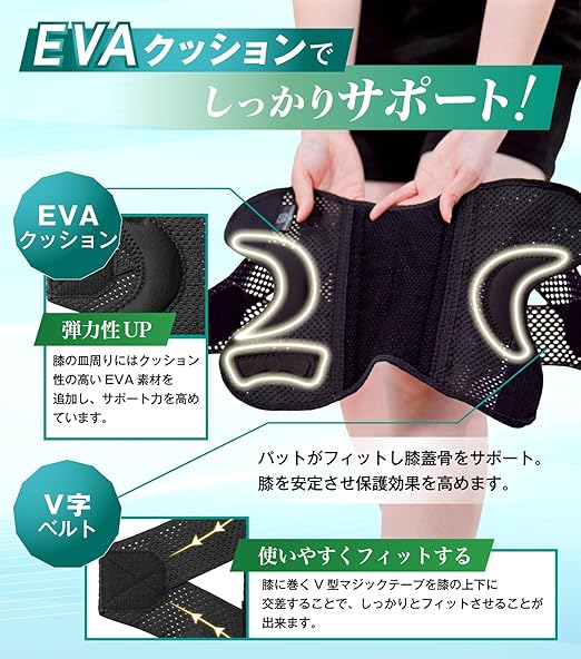 ✅【EVAパッドで優しくサポート】膝のお皿の左右に配置したEVAパッドが、動きに沿って自然にフィットし、膝関節をやさしく支えます。