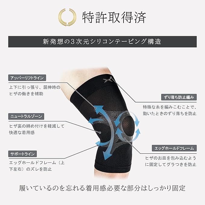 ✅国際特許取得の3Dシリコーンテーピングサポート:膝関節周辺の必要な部分だけを固定するため、しっかり固定されているのに動かしやすい。日本、米国、中国で特許を取得。