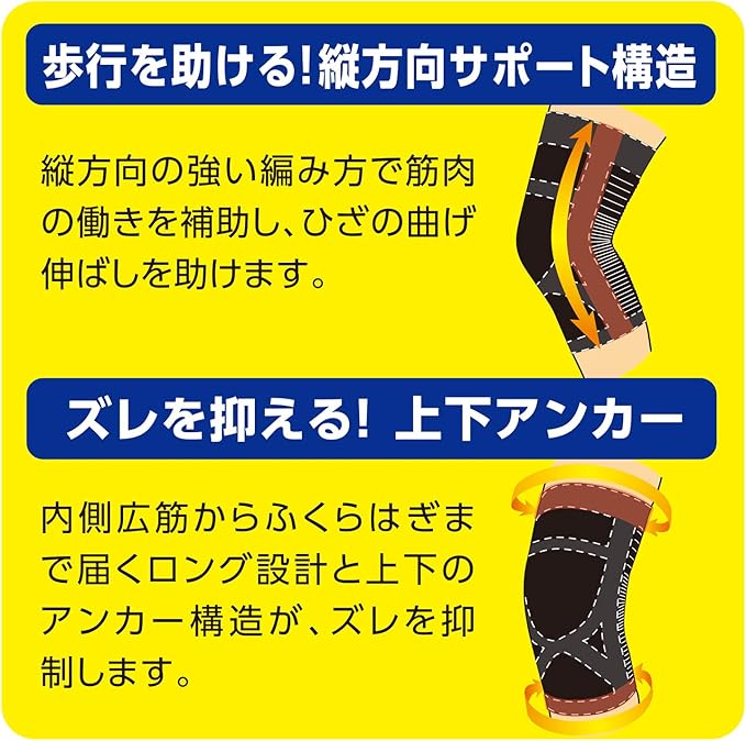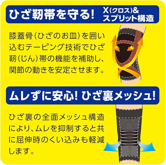 X(クロス)&スプリット構造が膝やじん帯を守り、縦方向サポート構造が歩行を助けます。