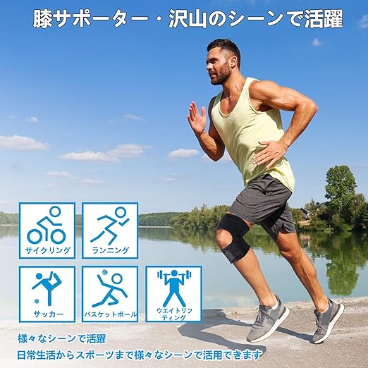 【質感・素材】:膝サポーター メッシュ設計、高耐久性の素材を採用します。速乾性に優れ、膝に負担をかけない軽さ、汗をかいても快適、長時間着けても楽です。肌に優しい素材、肌に直接触れる部分は柔らかな肌触りで刺激の少ない素材を使用しています。素材の馴染みや通気性に加え、長時間着用しても快適な履き心地を実現します。「S」と「L」まで2サイズが選べます。