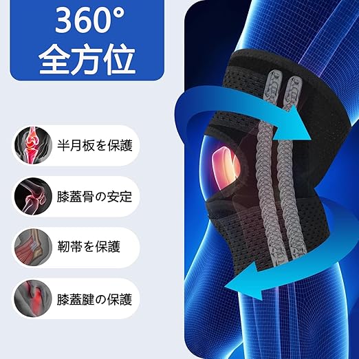 【に基づいた設計】:膝サポーター この膝当ては立体編み技術でしっかり作り。立体編み技術で耐久性が高く、長時間に使っても毛玉と雑な糸がありません。サイドバネの構造により、膝の皿をホールドして安定させ、膝上下に不安を取り除き、膝の摩擦と衝撃も対応します。