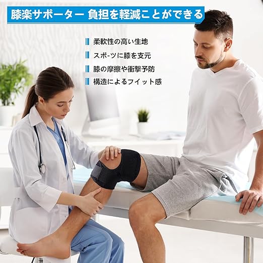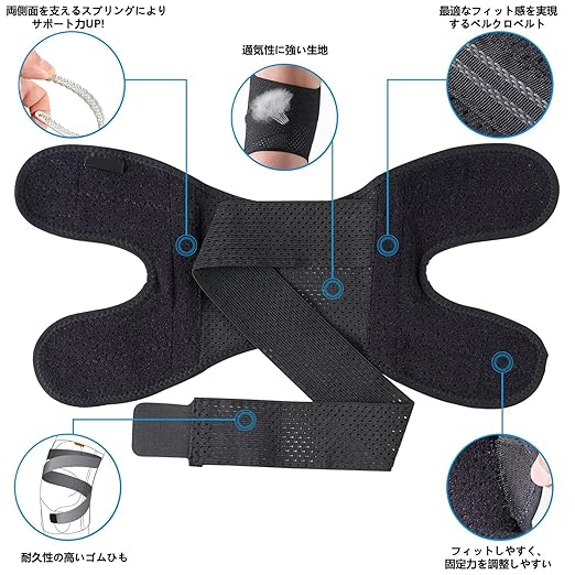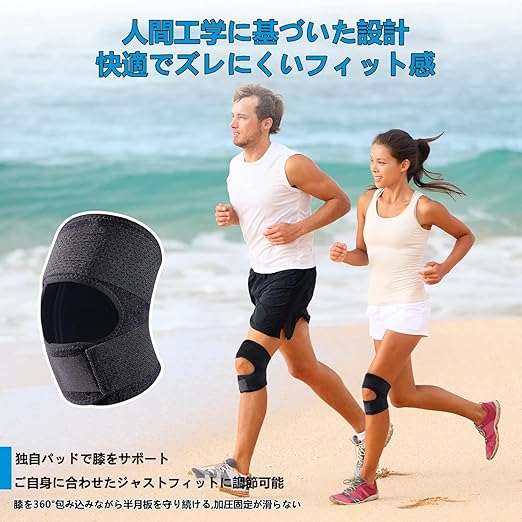 【可動性と安定性】膝サポーター膝の曲げ伸ばしが多い部分には、快適な着用感を追求したカーブカット構造を採用していますベルト式で、着脱がしやすくフィットします。日常生活から激しいスーポツまでも対応できます。膝の皿の两側に配置された月形パッドが、膝関節へのサポートを提供し、使用時の快適性を目指します。