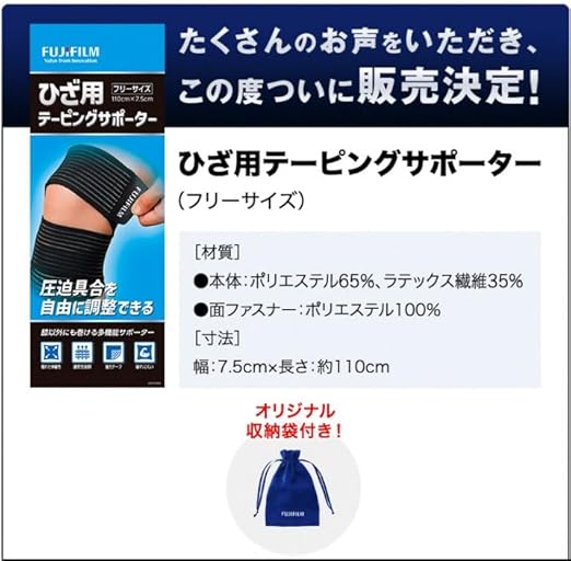 【たくさんのお声を頂き発売】もともと「ひざ用テーピングサポーター」は富士フイルムの関節ケア「アユメイト」「ヒザテクト」の企画特典としてご用意した非売品でした。ところが、お届けしたお客様から想定外の反響を頂き、皆さまのお役に立てるのであればと、発売が決定いたしました。