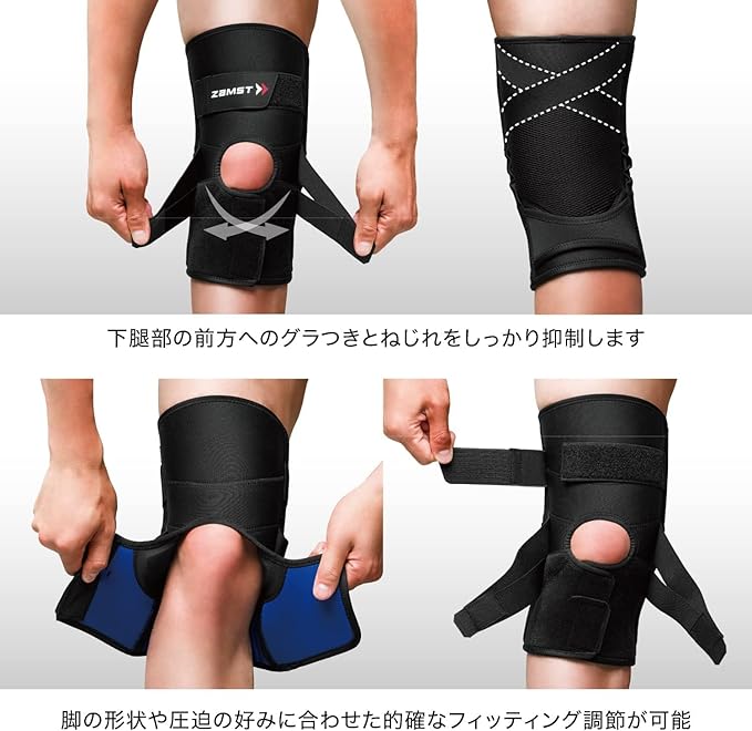 【下腿部の前方へのグラつきとねじれをしっかり抑制】本体の前下部とヒザ裏上部に装備したダブルXストラップが大腿部と下腿部を効果的に圧迫。またファンクショナルステーの連動により、下腿部の前方へのグラつきとねじれをしっかり抑制します。