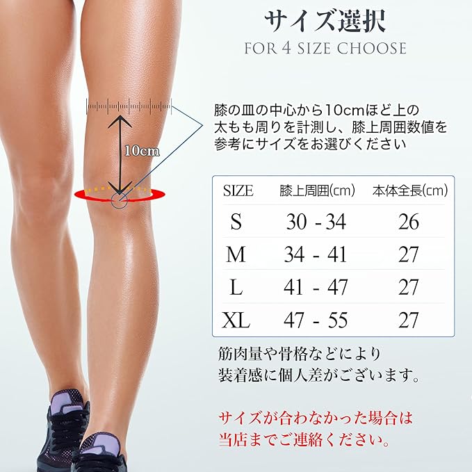 サイズ選択は膝上10cmの周囲を図り、サイズ表を参考にお選びください。膝上周囲目安 S:30-34cm M:34-41cm L:41-47cm XL47-55cm 2個セットの膝圧迫サポーター。ご自宅の洗濯が可能です。