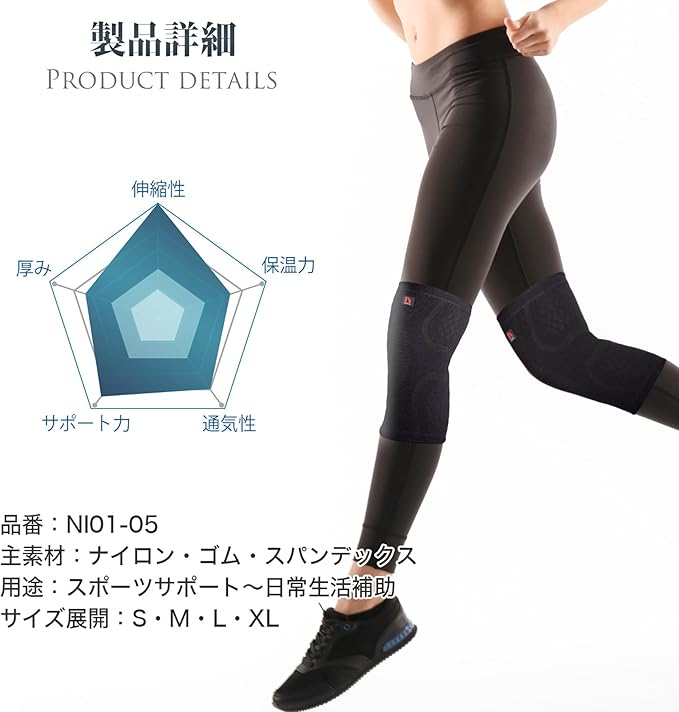 吸汗速乾・調温機能を持ったスポーツウェア素材を採用。スポーツ前にウォーミングアップをして体を温めるのと同様に、適度に膝を温めることでパフォーマンスの向上と怪我の予防をします。