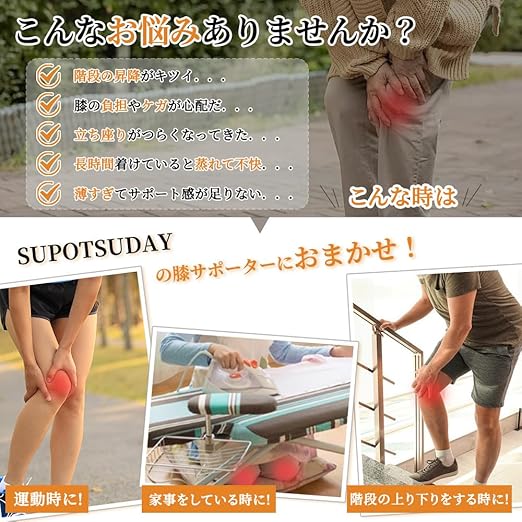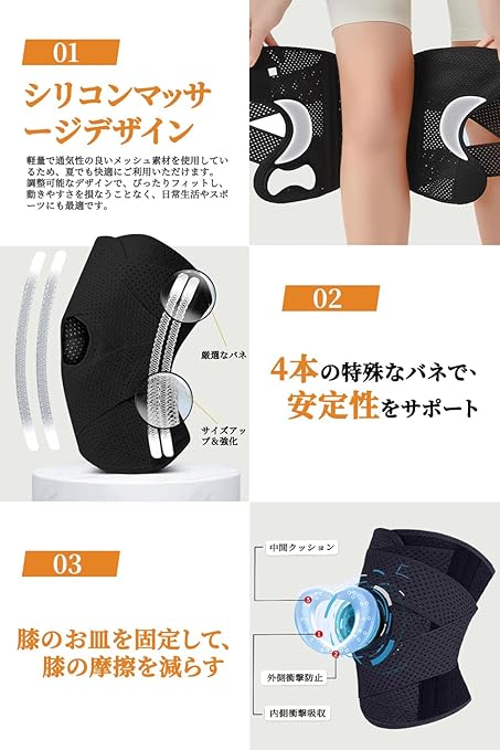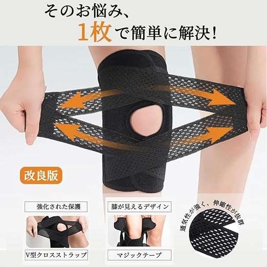 【耐久性に優れた高品質素材使用】 強力なナイロンやポリエステル素材で作られており、耐久性が高く、頻繁に使用しても長持ちします。膝の負担軽減をサポートし、膝の保護力が強化され、激しい運動やスポーツにおいて摩耗や破損を最小限に抑えます。さらに、膝固定機能により、サポーターがずれ防止し、長時間使用しても安心して利用できます。