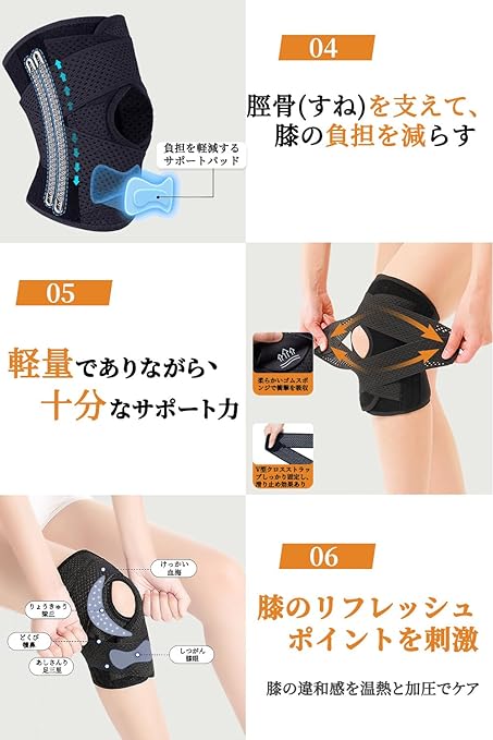 【スポーツやリハビリに最適な設計】 ジョギング、バスケットボール、サッカーなどの高強度なスポーツはもちろん、膝のリハビリや筋力強化にも効果的です。膝用サポーターは、膝の負担軽減と膝保護を提供し、可動域サポート機能で膝を守りながら動きやすさを維持します。日常生活でも安心して使用でき、膝のサポートを強化し、運動補助とリハビリ補助を兼ね備えた優れた製品です。