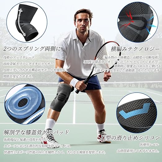 ✅構造と機能:肌に優しい生地で作られた膝サポーター。 両側バネと膝蓋骨ゲルパッドは、膝の負担を軽減するため設計しました。改良した滑り止めシリコン:運動中にずれ落ちません。