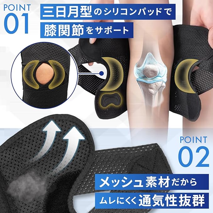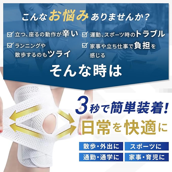 ✅【新発売特別クーポン配布中】膝サポーターは家事や立ち仕事・スポーツや部活・ランニングやジムトレーニング・ゴルフ・登山など、膝や膝間接のお悩みをしっかりサポートしてくれるアイテム!素材には通気性のいいメッシュ素材を採用し、伸縮性の高いV字型ベルトで膝全体を360 しっかりホールド。固定力・ズレにくさ・ムレない設計にこだわっています!