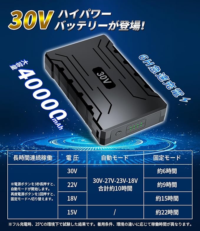 【空調作業服.フルセット・長時間安心連続稼働】セット内容:30V空調ファン*2、40000mAh専用.*1、急速充電器*1 、接続ケーブル*1、日本語取扱説明書*1。大容量ながら重さは約428gにとどまり、体積も10%小さく、耐久性も大幅に向上しています!高性能チップ搭載され、過充電保護、過放電保護、加熱保護、過電流保護、短絡保護などの安全保護機能を多数搭載!高品質なリチウムポリマー電池が搭載して、日本電気安全法認証(PSE)を取得し、安心にご利用いただけます。フル充電(付属の急速充電器の赤い指示灯が青くに点灯します。)の場合、最大22時間連続稼働可能です。高温環境の熱中症予防、熱中症対策などための空調機能付き作業服など最適な専用ファン.セットです!