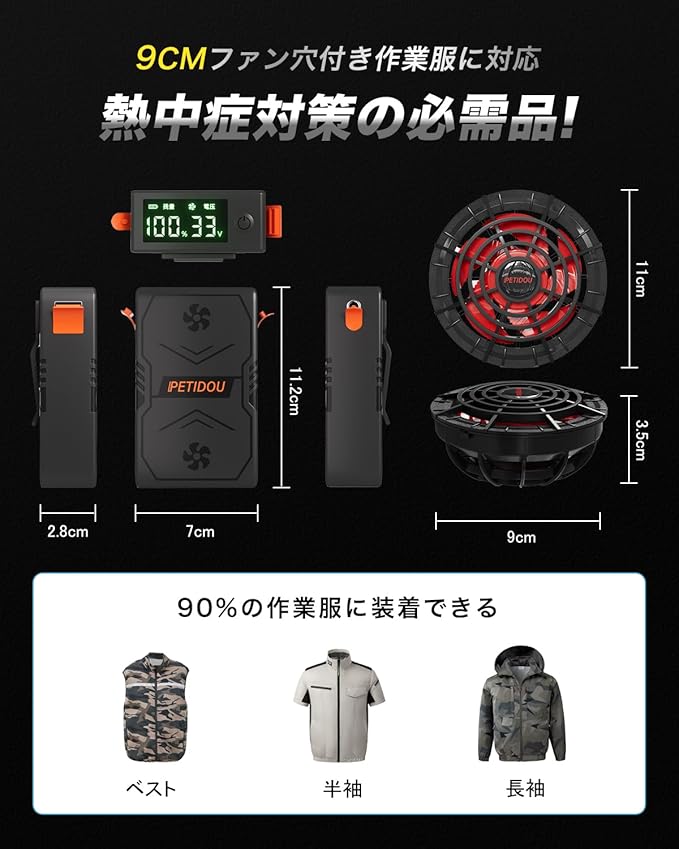❄️【高い交換性・熱中症対策必需品】ファン取り付け部の直径サイズは9cmで、市販の99%の服・ベスト・半袖・長袖など様々な空調作業服、空調パンツに対応でき、互換性が非常に高いです。炎天下の建設現場や屋外作業において、作業効率と安全性を同時に高めるアウトドア作業従事者必携のアイテムです。
