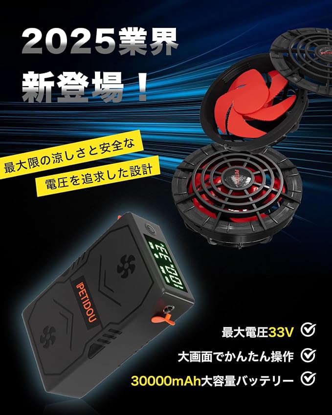 【33V超高出力 LED表示パネル】ファン.セット ファン付き作業服対応 30000mAh大容量. 最大32時間連続稼働 6段階風量調節 作業服適用直径9cm 熱中症対策 暑さ対策 男女兼用 日本語説明書付属 | oioioichan
