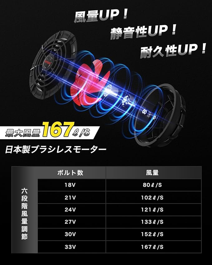 ❄️【2025年新作・33V超高出力・ファン. セット】2025夏全新型、空調作業服ファンは航空力学を応用した流線型6枚大面積羽根が搭載して、風の抵抗を45%低減し、風が中心に集まり直進性が高く、パワフルな風を生み出します。高出力ながら安全性にも配慮し、使用シーンや体感温度に応じて柔軟に風量を調整可能。