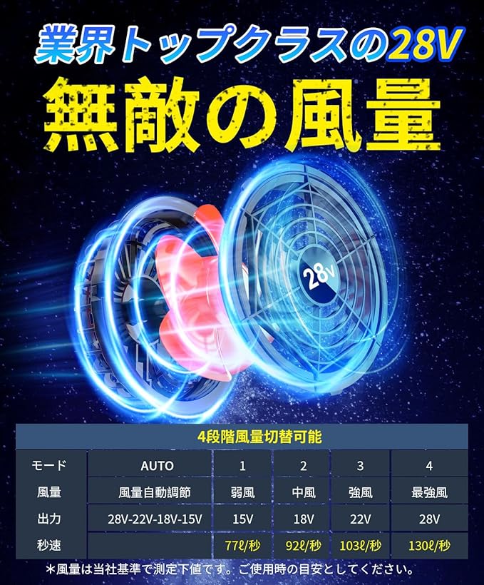 【2025業界初&28V超高出力&作業服 ファン.セット】2025年最新の熱中症対策、28V 超高出力ファン.セットが登場!最新型 空調作業服用ファンは航空力学を応用した流線型5枚大面積羽根が搭載して、風の抵抗を40%低減し、風が中心に集まり直進性が高く、パワフルな風を生み出します。30000mAh大容量専用.が搭載され、ワンボタンでAUTO-15V-18V-22V-28Vに5段階切り替えるだけでなく、同類製品に比べると28V最強風量モードでもパワーが一定で、風量が弱くならないでずっと130ℓ/秒で服内に暴風を送ります。28V暴風はいっそう強く、服内を駆け巡る風が、衝撃的な爽快感を生み出す!お手元の空調作業着の性能を最大限発揮できます。