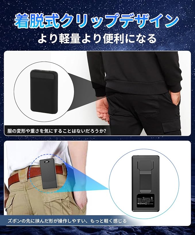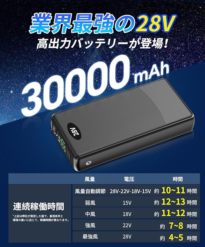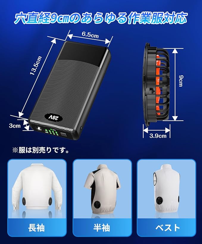 【28Vハイパワー.&30000mAh大容量&着脱式クリップ設計】2025年最新型ファン付き作業服の28V高出力.は、暑い夏の作業環境を一変するパワフルな大風量を実現!更に、3,0000mAhの大容量があり、15Vで約12時間、28Vで5時間まで連続稼働できます。驚くほどの爆風が、より長時間維持できます。.の電源ポタンを押すと、AUTO-15V-18V-22V-28Vの順番に調整できます。お使いになられる環境に合わせて、最も相応しい出力が選べます。高品質なリチウムポリマー電池が搭載して、日本電気安全法認証(PSE)を取得しました。安心にご利用いただけます。.の着脱式クリップデザイン、服の変形を避け、ズボンの先に挟んだ形が操作しやすい、もっと軽く感じる。