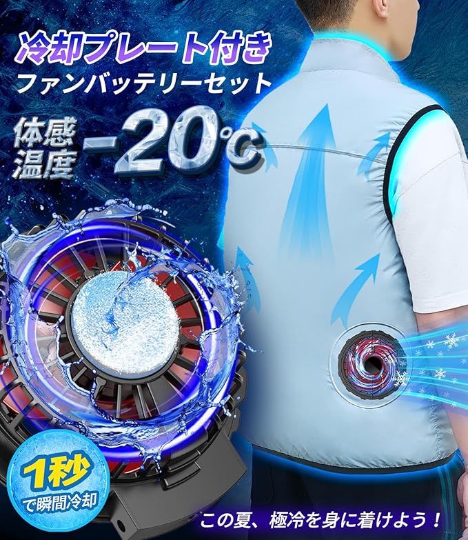 【2025業界初・冷却ブレート付き・ファン . セット】2025夏の熱中症対策対応、30V超高出力の上、冷却ブレート搭載したファン.セットがついに登場!暴風体験の上に、ペルチェ素子冷却技術で瞬間に冷却します。ボタンを押すと、大量の超涼しい空気が服の中を迅速に循環し、服内の汗を素早く乾燥し、蒸し暑い空気を排出し、暴風感はいっそう強く、衝撃的な爽快感を生み出す!お手元の作業着の性能を最大威力発揮できます!.は金属製仕様で、防水防塵と耐久性が優れています。炎天下の建設現場や屋外作業において、作業効率と安全性を同時に高めるアウトドア作業従事者必携のアイテムです。
