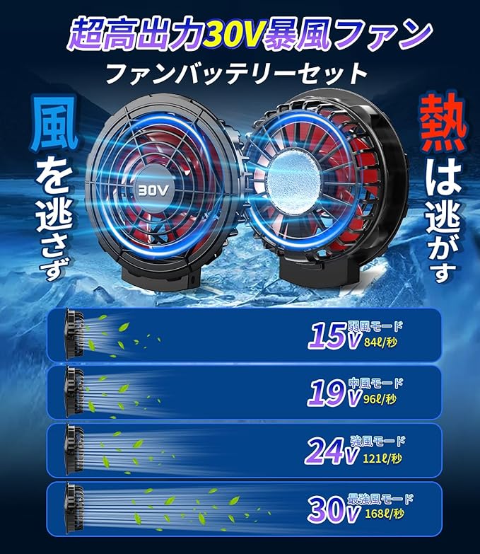 【暴風に進化した168ℓ/s特大風量&3D循環送風&冷却モード】空調作業服・ファン付き作業着専用のファン.セットは安定送風と静音性を兼ね備えた2025猛暑の定番アイテムです。✔航空力学を応用した流線型5ブレードの超薄型ファンボディを採用し、風の抵抗を50%低減します優れたトルク特性、高出力で電源を入れた瞬間から驚くべき超強風を体験できます。✔2種類モード(風量モードと冷却モード)が搭載され、電池ボタンを押すと、15V/19V/24V/30Vに4段階切り替えて、最大18時間連続稼働します。ファンが動作中、本体の冷却ボタンを一回押すと、冷却機能が動作開始します。再度電池ボタンを押すごとに、4段階冷却モードを切替て、最大5時間のクールさを持続可能です作業現場以外でもキャンプやピクニックなどのアウトドアや、農作業、運送業、釣りやツーリング、スポーツ観戦や屋外イベントなど、様々なシーンで大活躍します。