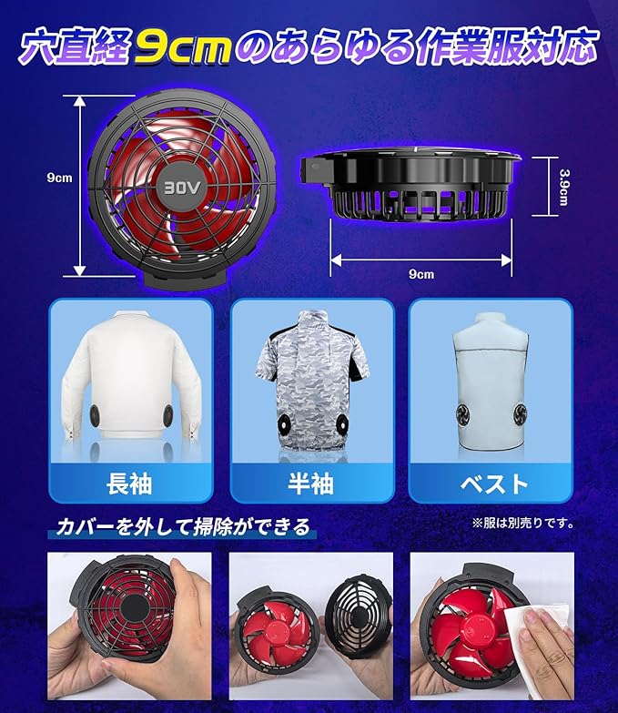 ファン.セット【冷却ブレート付き&30V超強力&40000mAh大容量】空調作業服 . ペルチェ素子式 ファン付きベスト用 .セット 5段階風量調整 PSE認証済 扇風機付き作業着 90mm服穴径対応 暑さ対策 | oioioichan
