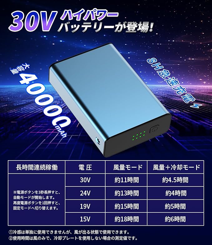 【30Vハイパワー・ 40000mAh超大容量・PSE認証済み】涼しさを18時間持続できる40000mAh超大容量、約4.5時間の急速充電でストレスフリー!1日使えるタフ.ファンセットです。長時間仕事をしていても常に涼しい風を感じることができます。.はすでにPSEの認可を得ており、高品質AIチップを内蔵しており、過熱保護、過電流保護、過負荷保護、短絡保護、過充電保護、自動回復など安全機能を搭載しています。炎天下での作業時に体感温度を最適化にすることで、実用性と便利性を兼ね備えた空調 ファンです。。✔DC調速ケーブルは高品質の鋼線二重編み込みナイロンで作られています。PVCより耐久性が30%UPしつつ、良い柔軟性を持っています。内部は、錫と純銅を採用されており、良い耐久性を確保しながら優れる導電性を実現します。熱中症などの危険や作業効率の低下を防ぐだけでなく、空調設備やランニングコストを抑える省エネ効果を発揮します。(※上記の使用時間は特定環境での数値となります。実際のご使用時間と異なる場合はございます。)