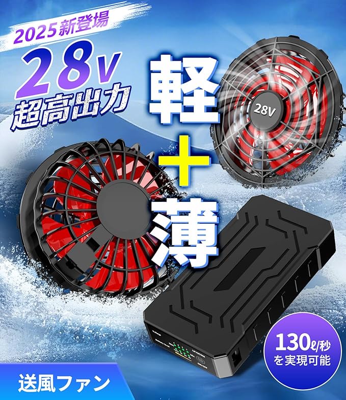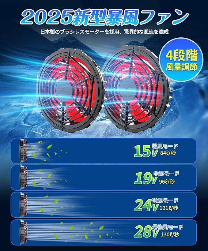 【2025業界新空調作業服ファン.セット】2025最新作!28V高出力・最大130L/S 風量ファン付き作業服用ファン.セットが登場!一日中に連続使用ができる30000mAh大容量専用.!ワンボタンで15V-19V-24V-28Vに4段階切り替えるだけでなく、同類製品に比べると28V最強風量モードでもパワーが一定で、、低振動及び低騒音で作業効率も大いに上がります。真夏のべたつく汗、焼けつくような日差し対策として活躍します。28V暴風はいっそう強く、服内を駆け巡る風が、衝撃的な爽快感を生み出す!お手元の空調作業着の性能を最大限発揮できます。