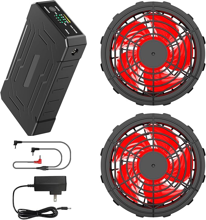 【熱中症対策・あらゆる作業服に対応可能】ファン取り付け部の直径サイズは9cmで、市販の90%の空調作業服、空調ベスト、空調パンツに対応でき、互換性が非常に高いです。ファン付き作業服と最適な組合せです。最新型ファンはABS樹脂を使用し重さ92g/個、厚さ3.2cmで超軽量・超薄型ながら衝撃に強い耐久性を兼ね備えています。建築・土木・工場内作業・漁業・林業・農場・農園・野外作業・運送業・倉庫内作業・登山・ウォーキング・ゴルフ・ツーリング・キャンプ等、夏のスポーツ・レジャーなど様々なシーンで大活躍!【セット内容】ファン*2 .*1 接続ケーブル*1 専用充電器*1 取扱説明書