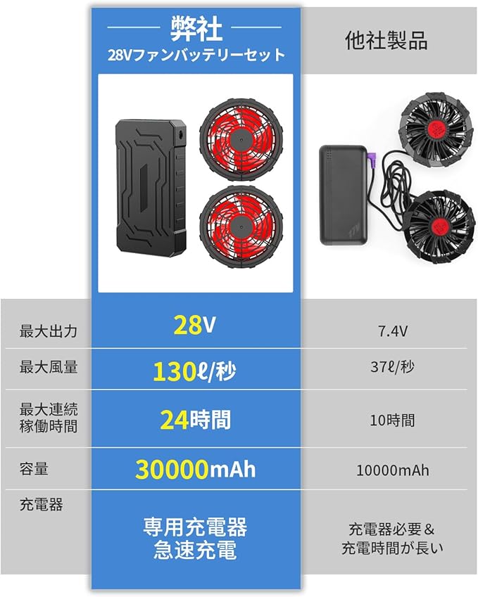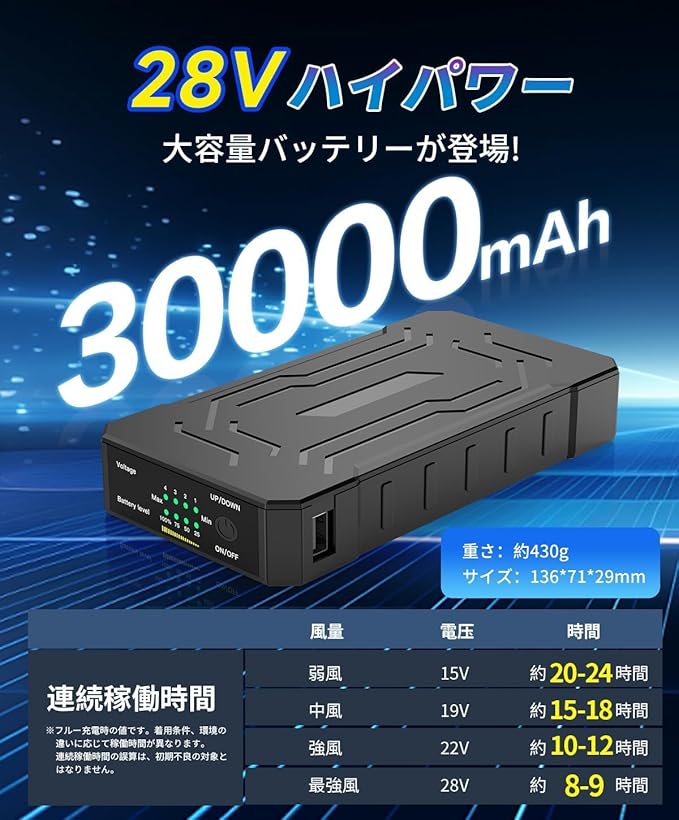 【30000mAh超大容量.超長時間稼働】最新型ファン付き作業服の28V高出力.は超大容量で最大15時間連続送風できます。炎天下で長時間作業される方におすすめ!4段階風量(28V/24V/19V/15V)切替可能。残量表示できる超高性能空調ファン.です。「28V」最強風量モード約8~9時間連続稼働、「15V」約18~20時間、従来の使用時間に比べて大幅にアップしました!長時間仕事をしていても常に涼しい風を感じることができます。USBポートは5V 2Aの出力仕様で、スマートフォンの充電も可能です。.セットがPSE認証取得済み、日本国内で使用されている規格に準拠しているので、良い実用性と優れた耐久性を兼ね備えている安心安全の暑さ対策グッズです。