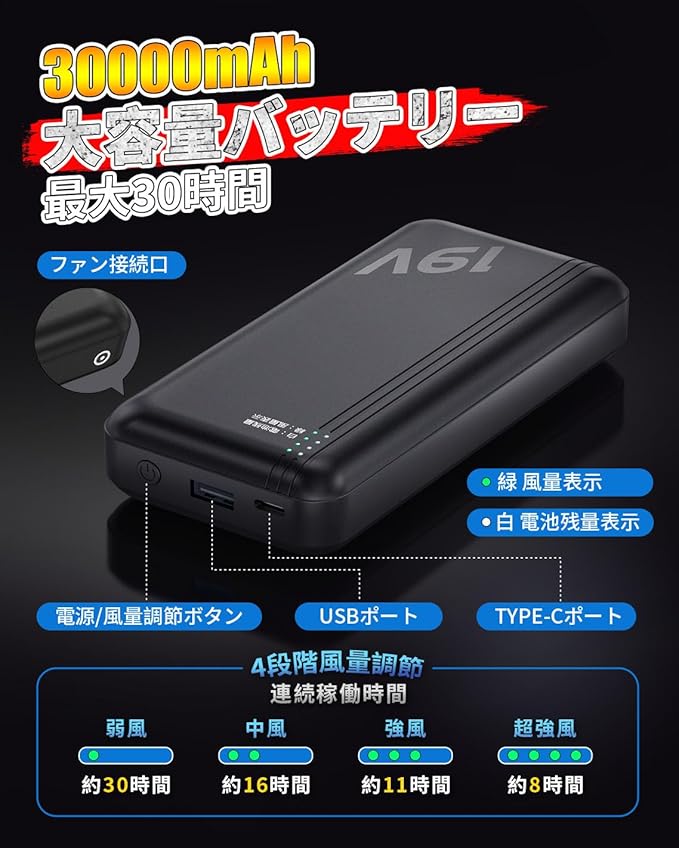 【30000mAh超大容量.】空調作業服には30000mAhの超大容量.が付属し、最大30時間の連続稼働は実現可能です。さらに、日本の安全基準に適合したPSE認証を取得しており、安定した充放電が可能で、人体に害を及ぼすことなく、長時間でも安心してお使いいただけます。