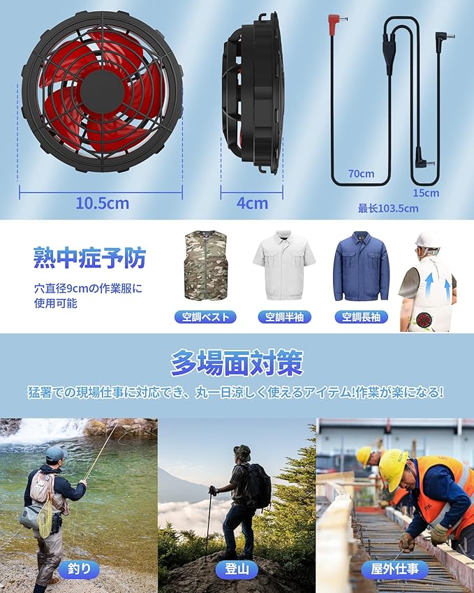 【様々な場面に適しています】い夏において、風冷式の調整可能な扇風機セット。最新型ファンはABS樹脂を使用し、衝撃に強い耐久性を兼ね備えています。建築・土木・工場内作業・漁業・林業・農場・農園・野外作業・運送業・倉庫内作業・登山・ウォーキング・ゴルフ・ツーリング・キャンプ等、夏のスポーツ・レジャーなど様々なシーンで大活躍!"