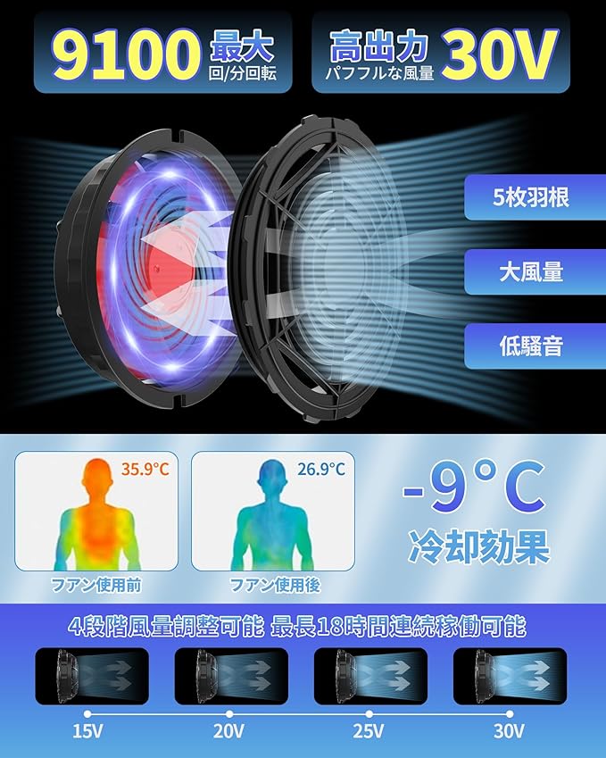 【強風・低騒音・高寿命】ブラシレスモーターを使用することで、ファン駆動の性能が大幅に向上します。従来モデルより長時間高電圧を出力しても安定し、さらに高速回転で送風効率もアップします。これにより、低コストで電力を最大限に活用して省電力になります。夏の幅広い現場作業において、疲労軽減、作業効率の向上、熱中症対策にも効果あります。